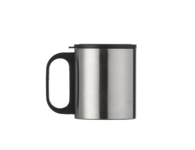 Caneca de inox 180ml com cabo e tampa em plástico resistente (não é térmica).