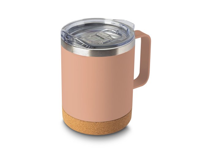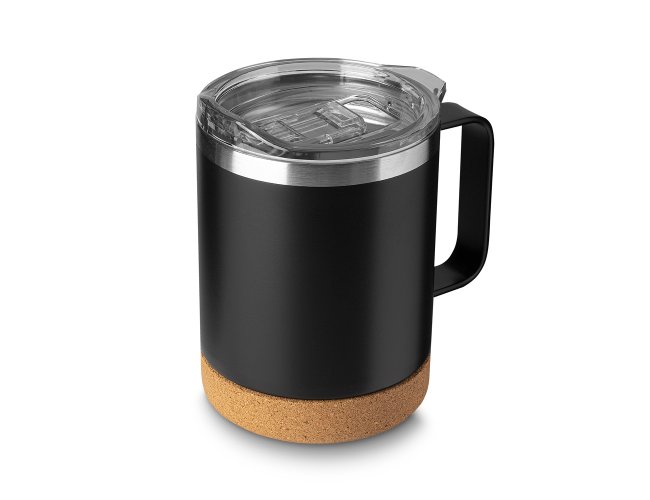 Caneca térmica em aço inox com capacidade 350ml, parede externa com pintura a pó. Parede dupla isolada à vácuo, tampa plástica com anel em silicone para vedação, alça lateral em inox na cor do produto, base em cortiça.
