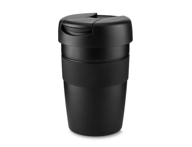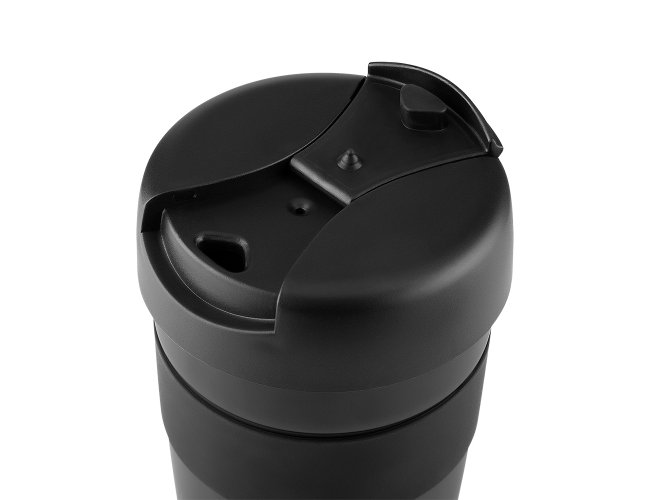 Caneca em aço inox com parede dupla isolada a vácuo com capacidade de até 350ml. Conserva temperatura quente ou fria, pegador em silicone, tampa com rosca e anel de silicone para vedação.