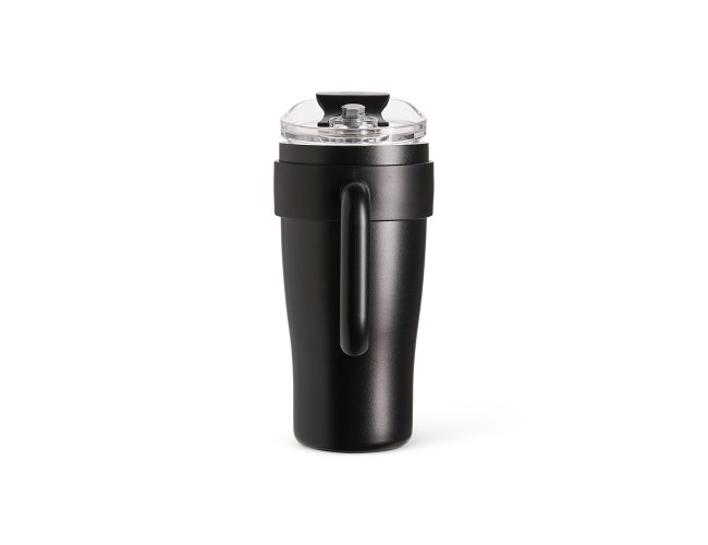 Caneca térmica em inox com capacidade máxima de 800ml. Possui estrutura em parede dupla, alça ergonômica em plástico, tampa rosqueável com vedação a vácuo, protetor para bocal e acesso para canudo com tampa em silicone.