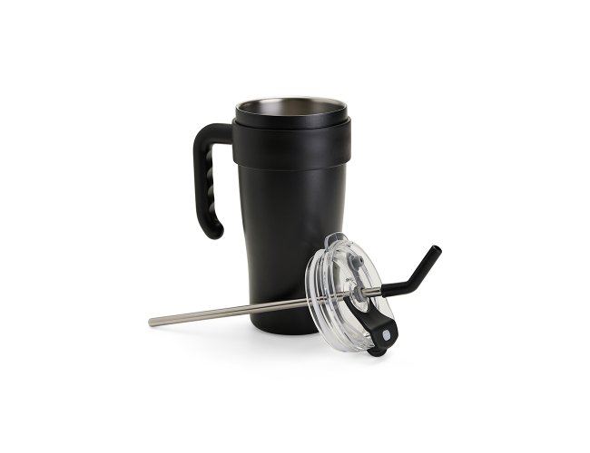 Caneca térmica em inox com capacidade máxima de 800ml. Possui estrutura em parede dupla, alça ergonômica em plástico, tampa rosqueável com vedação a vácuo, protetor para bocal e acesso para canudo com tampa em silicone. Acompanha canudo de inox com ponta de silicone removível.