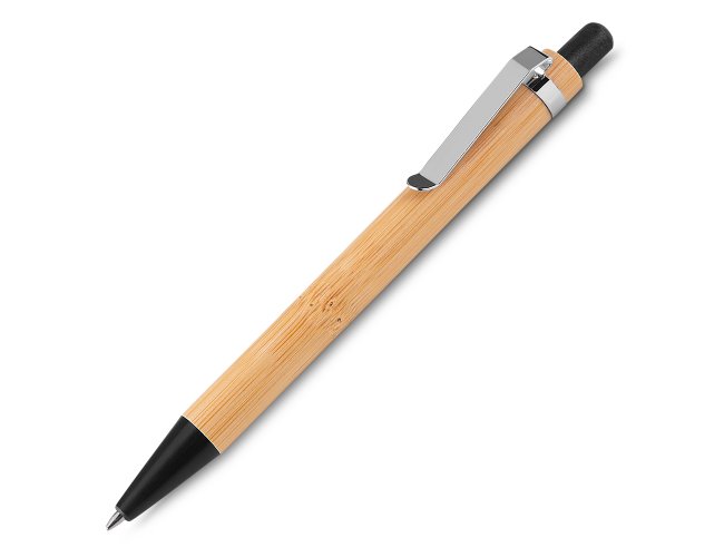 Caneta corpo de bambu com detalhes em plástico e metal.
