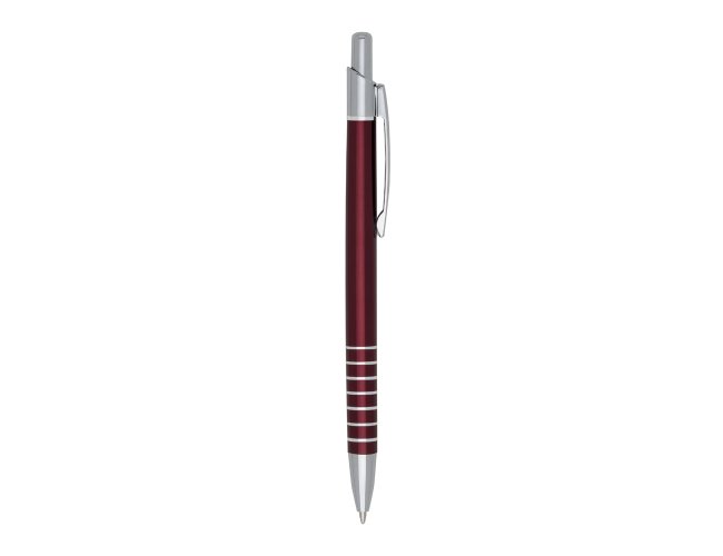 Caneta metal fina inteira colorida com detalhes prata. Clip de meta, possui sete anéis na parte inferior. Aciona por clique.