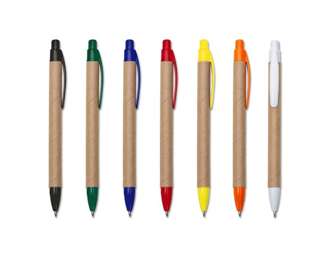 Caneta ecológica de papelão com detalhes coloridos, o clip pode facilmente ser retirado para personalização no corpo da caneta. Clip e ponteira plástica, aciona por clique.