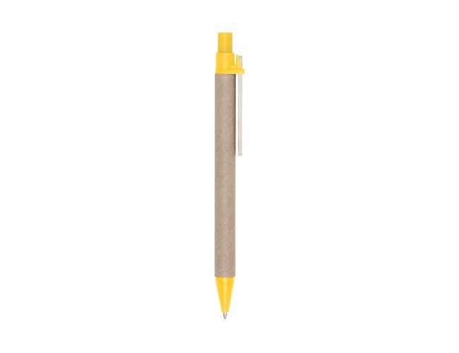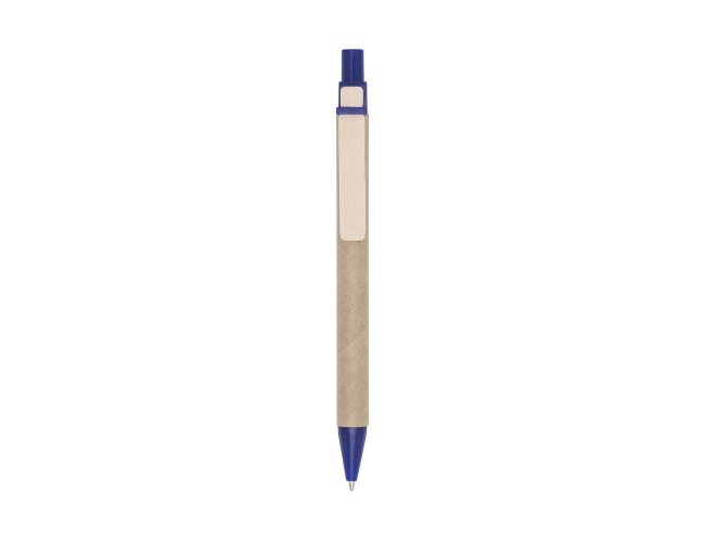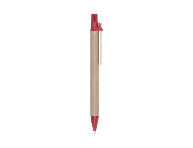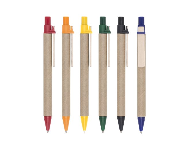 Caneta ecológica de papelão com detalhes coloridos. Clip de madeira e ponteira plástica, possui relevo na ponteira. Aciona por clique.