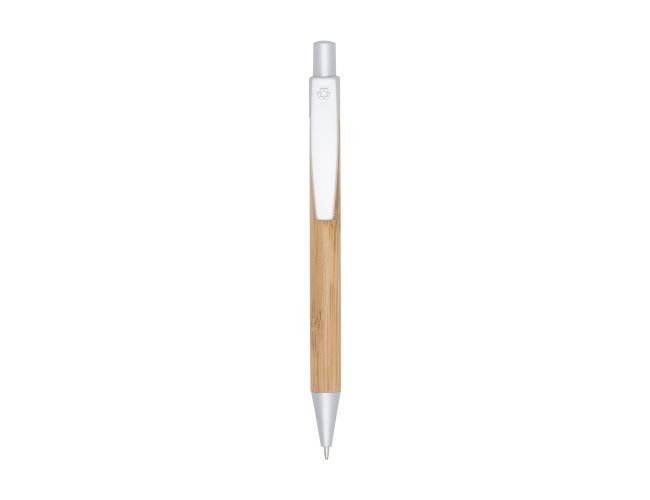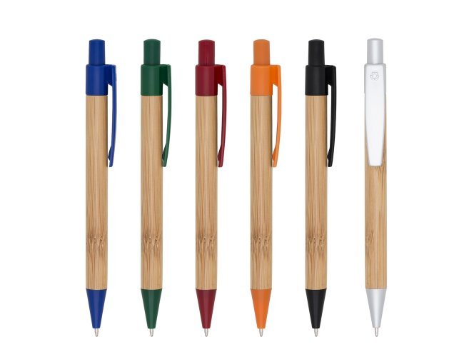 Caneta ecológica em bambu com detalhes plásticos, possui logo reciclado na parte superior do clip. Acionada por clique.