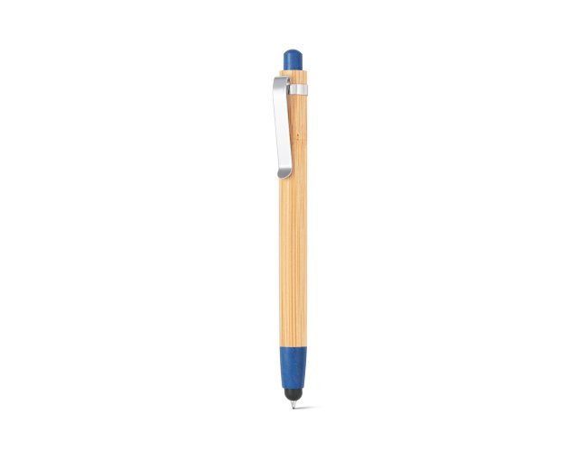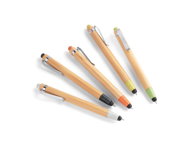 Esferográfica em bambu com ponteira touch e clipe em metal. Os elementos coloridos são em fibra de trigo e ABS. Até 1,5 km de escrita. ø11 x 139 mm