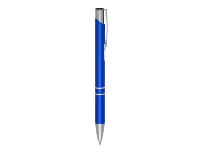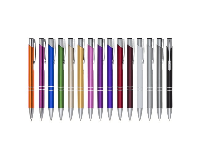 Caneta metal inteira colorida com detalhes prata. Clip metal com a ponta do acionador preto, parte inferior com dois anéis prata. Aciona por clique.