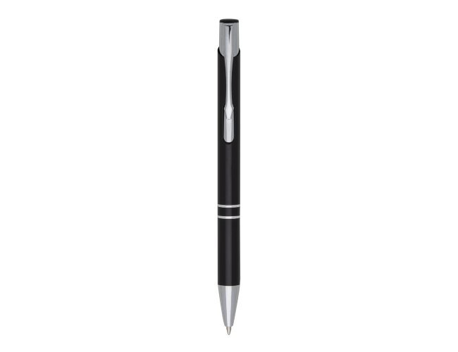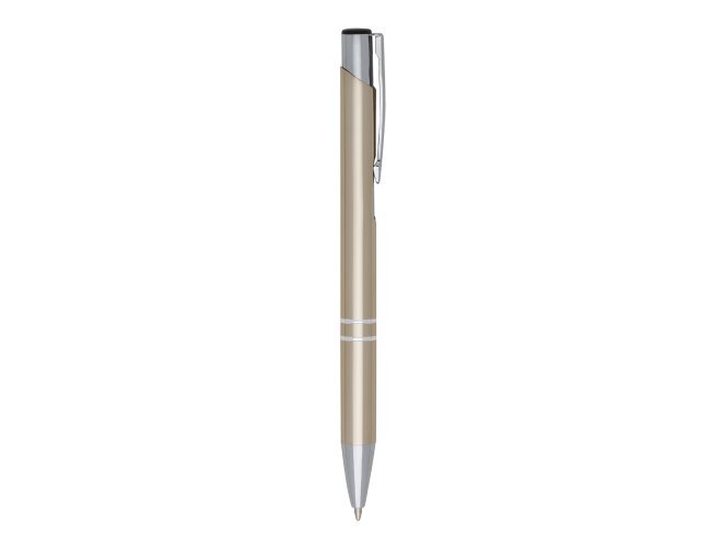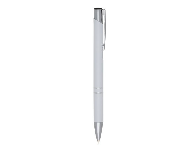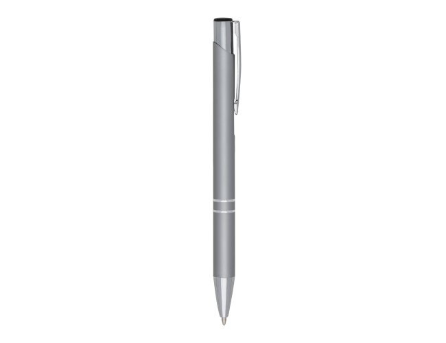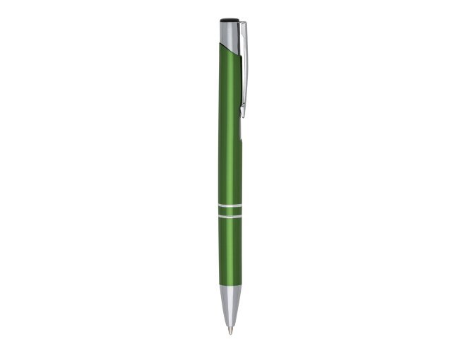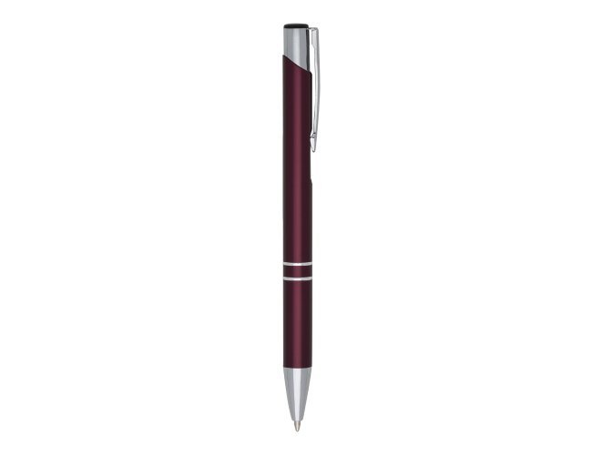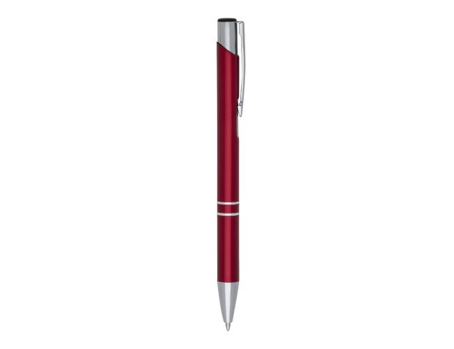 Caneta metal inteira colorida com detalhes prata. Clip metal com a ponta do acionador preto, parte inferior com dois anéis prata. Aciona por clique.