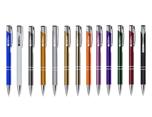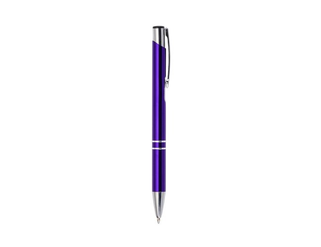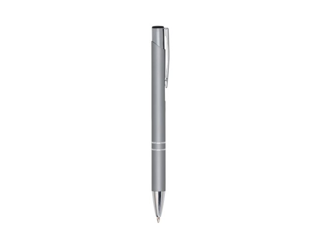 Caneta metal inteira colorida com detalhes prata. Clip metal com a ponta do acionador preto, parte inferior com dois anéis prata. Aciona por clique.
