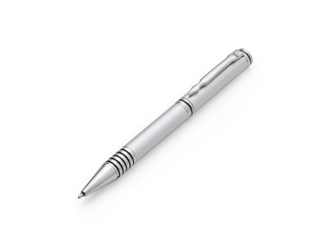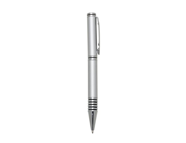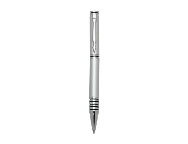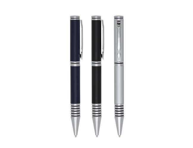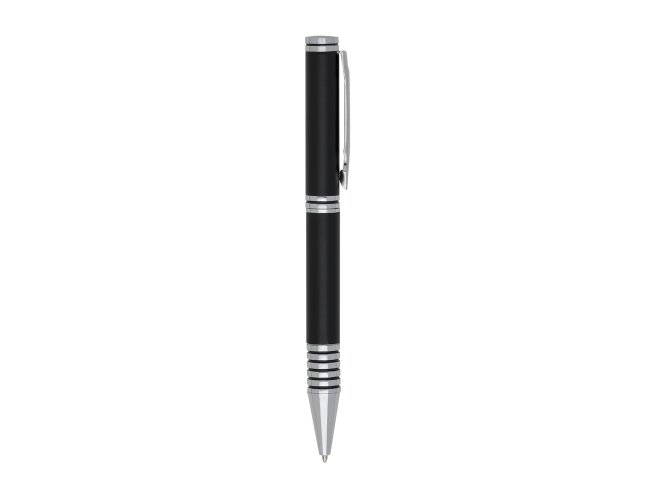 Caneta metal inteira colorida com detalhes prata. Clip metal, possui anel preto em relevo na parte superior e no centro. Seis anéis prata na parte inferior com um detalhe preto. Aciona por giro.