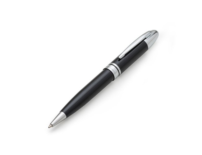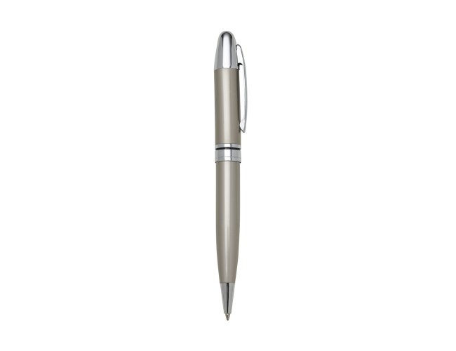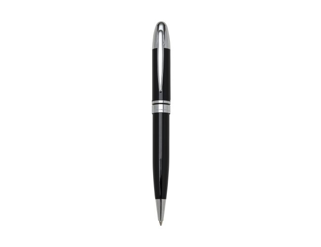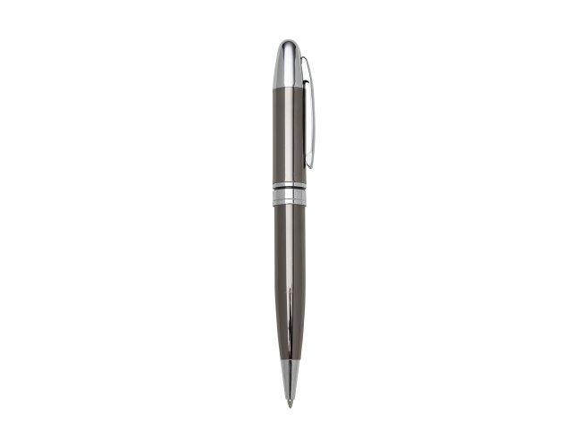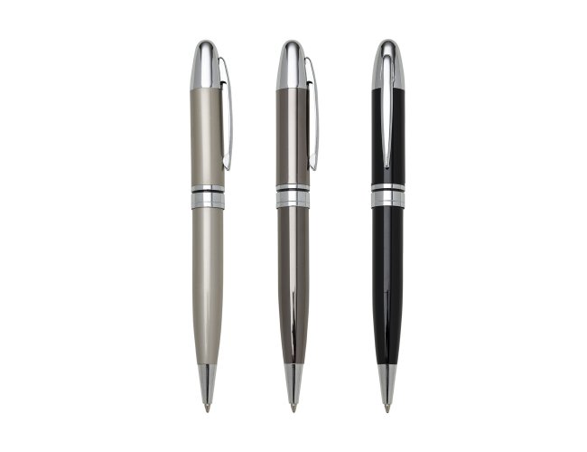 Caneta metal inteira colorida com detalhes prata. Clip metal e anel central possui: anel fino prata, anel preto fino e um anel maior prata com relevo. Aciona por giro.