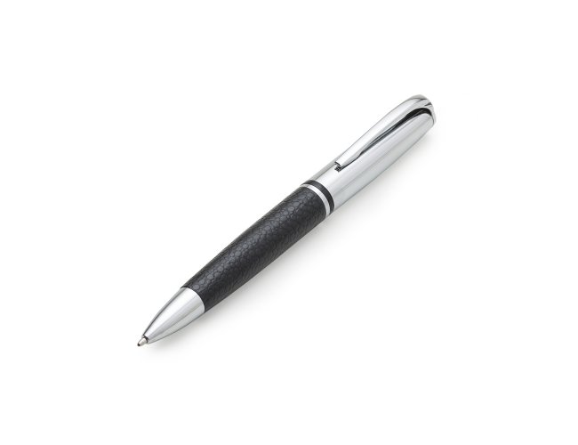 Caneta metal prata com detalhe em couro. Clip metal com a ponta colorida, possui anel central preto e dois anéis em relevo na ponteira. Possui as versões fosca e brilhante, aciona por giro.