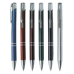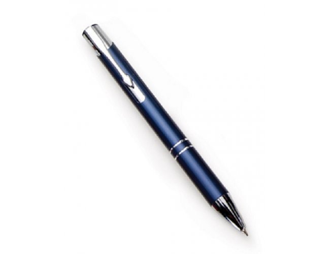 Caneta metal inteira colorida com detalhes prata. Clip metal com a ponta do acionador na cor da peça, parte inferior com dois anéis prata. Aciona por clique.