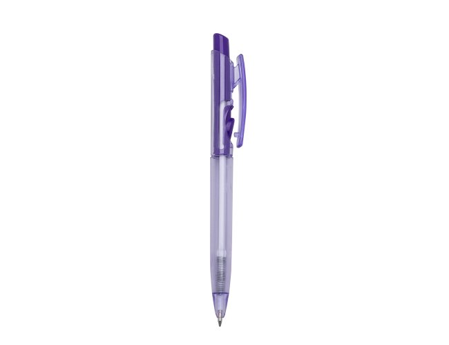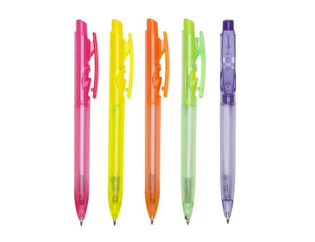 Caneta plástica fosca inteira colorida. Aciona por clique e para destravar basta apertar a parte inferior do clip.