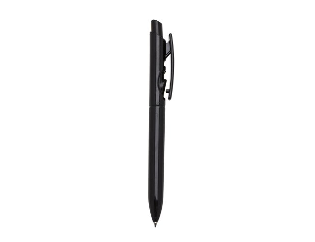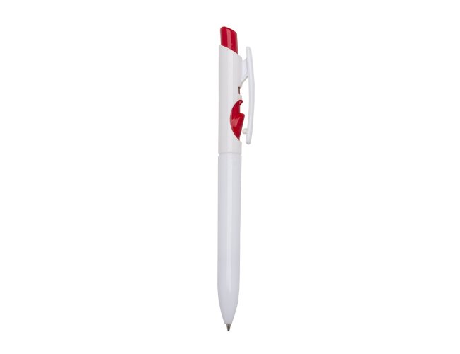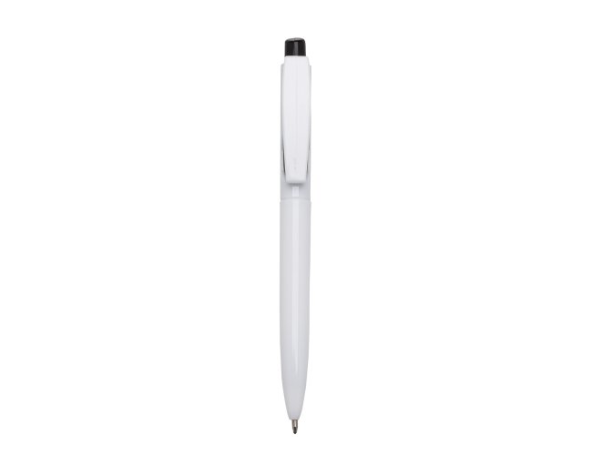 Caneta plástica branca com detalhes no acionador e destravador colorido. Aciona por clique e para destravar basta apertar a parte inferior do clip.