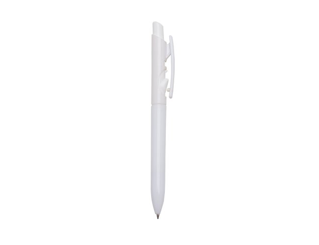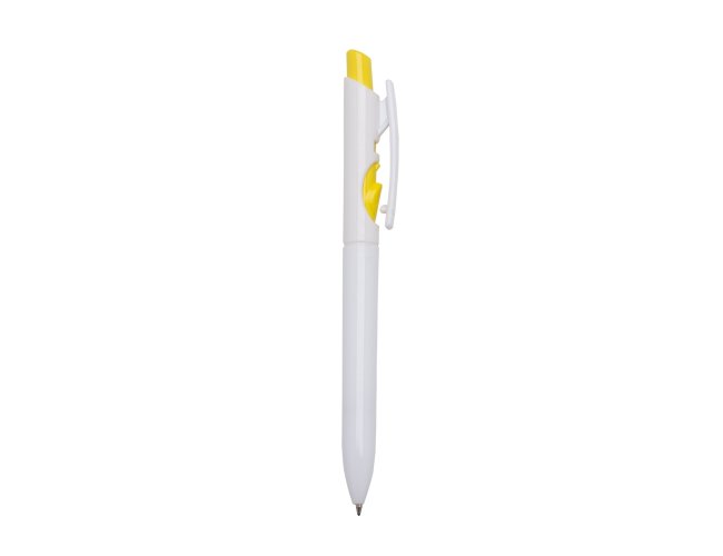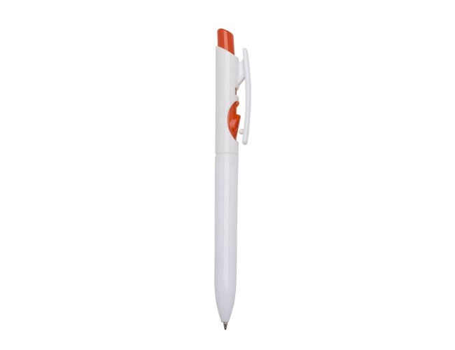 Caneta plástica branca com detalhes no acionador e destravador colorido. Aciona por clique e para destravar basta apertar a parte inferior do clip. Tamanho total aproximado (CxD): 13,7 cm x 1,6 cm. Peso aproximado (g): 7