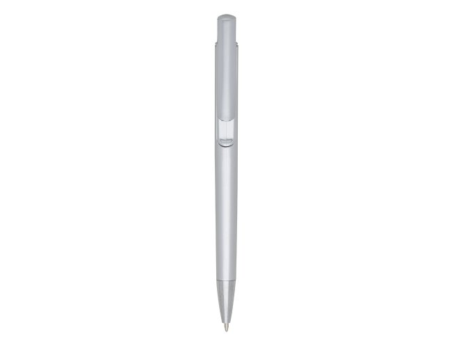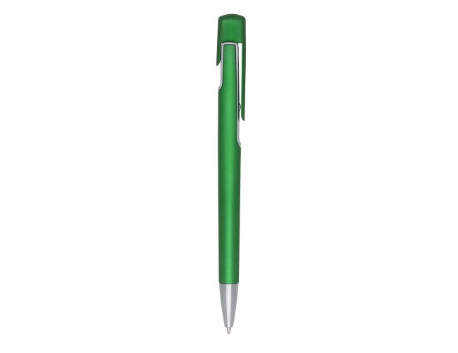 Caneta plástica inteira colorida com detalhes em prata. Possui um clip com design espaçoso ideal para gravação, aciona por clique.