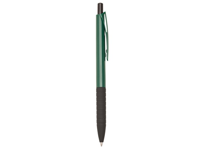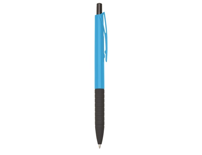 Caneta Plástica 401b colorida com detalhes preto. Clip plástico com detalhe vazado nas laterais, acionador e parte inferior preta com oito anéis em relevo. Aciona por clique.
