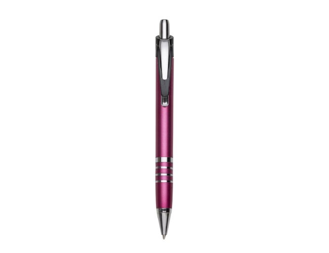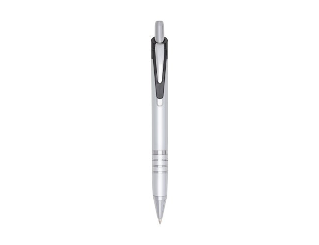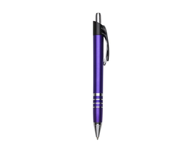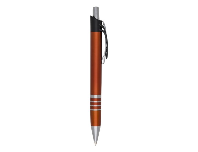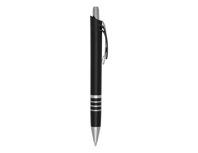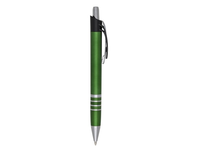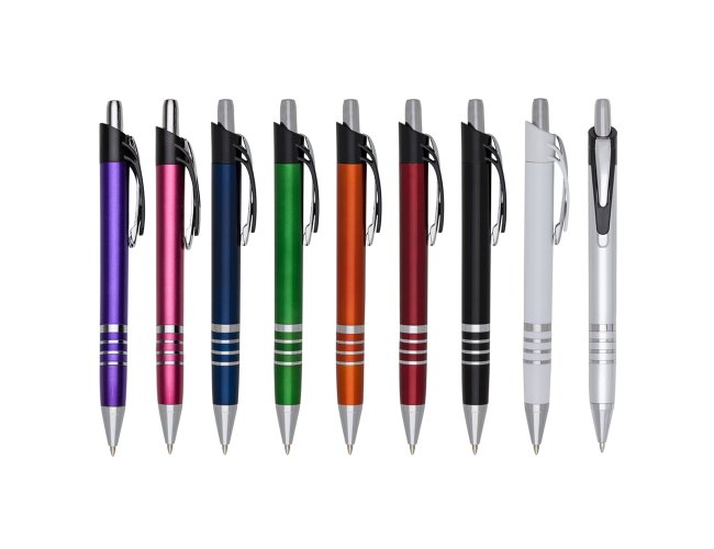 Caneta plástica inteira colorida com detalhes prata. Possui clip de metal com detalhe plástico preto, parte inferior com três anéis coloridos. Aciona por clique.