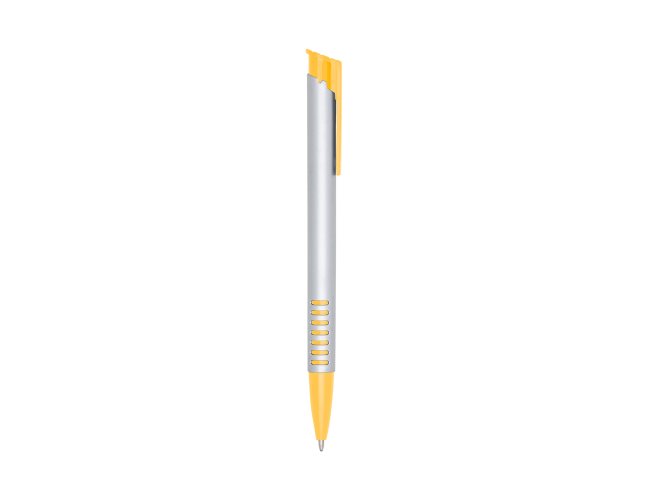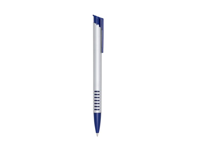 Caneta plástica corpo prata com detalhes coloridos. Clip plástico colorido e parte inferior com sete linhas coloridas. Aciona por clique.