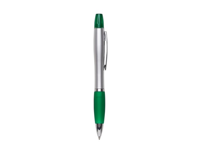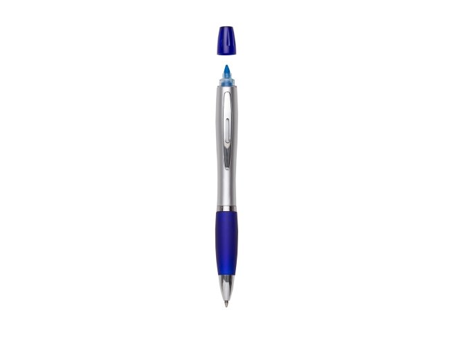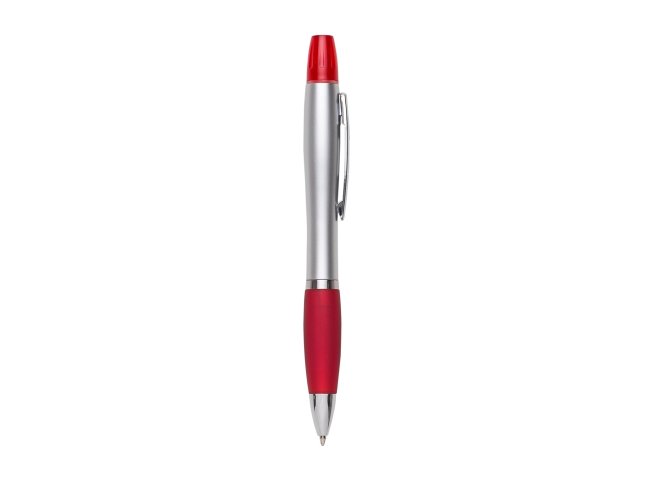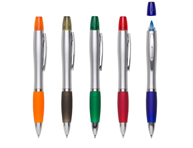 Caneta plástica com marca texto, corpo prata com anel inferior e detalhe emborrachado colorido. Clip metálico com detalhe vazado no centro, possui tampa plástica para o marca texto. Aciona por giro.