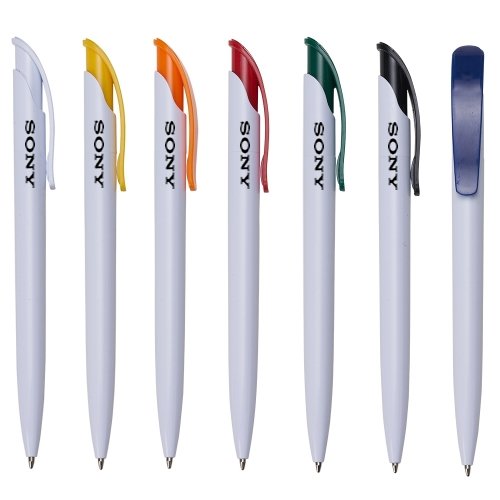 Caneta plástica branca com clip colorido. Aciona por clique.