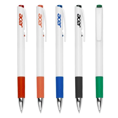 Caneta plástica de corpo branco e detalhes emborrachado. Acionador plástico colorido, aciona por clique e é destravado pressionando a parte inferior do clip.
