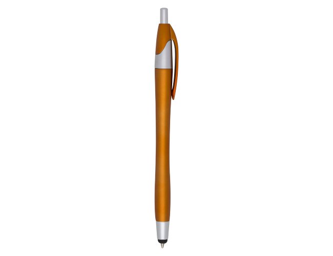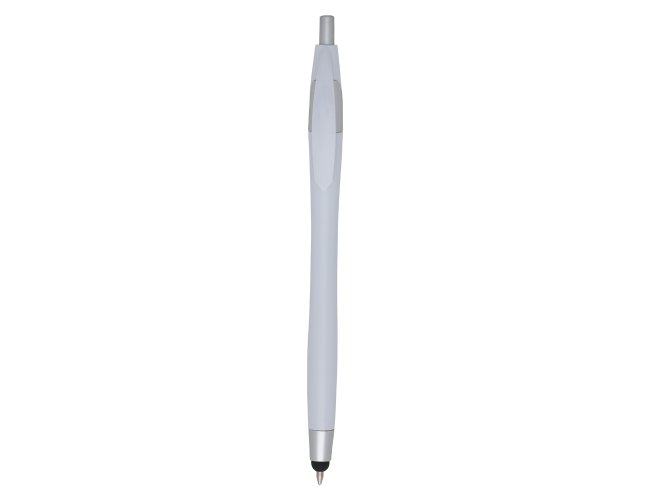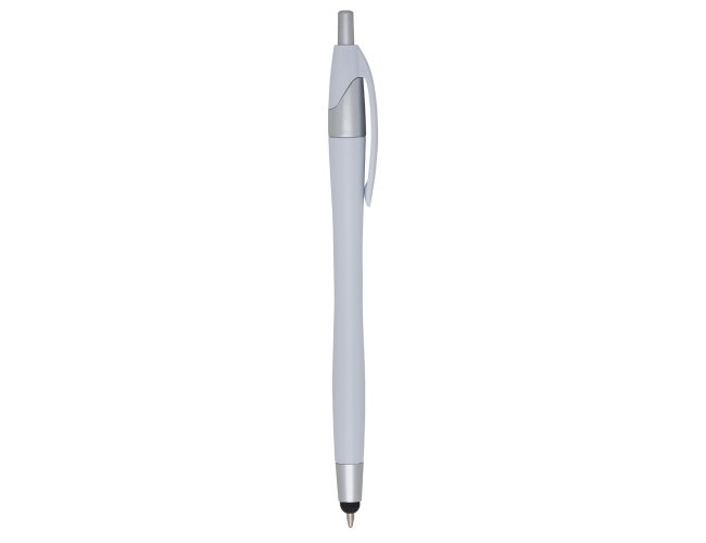 Caneta Plástica com Ponteira Touch 12638, inteira colorida com detalhes prata. Aciona por clique, ponteira sai através da borracha touch. Tamanho total aproximado (CxD): 14,1 cm x 1,4 cm. Peso aproximado (g): 7