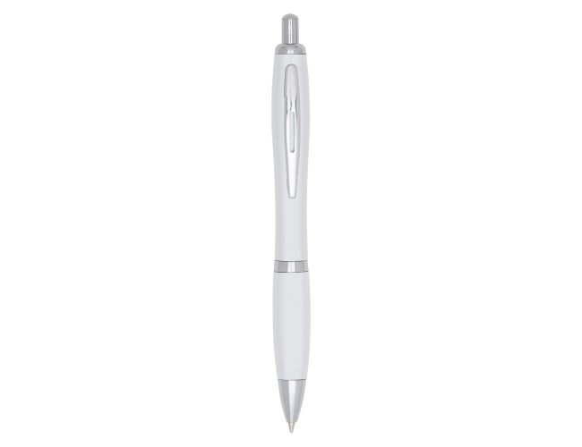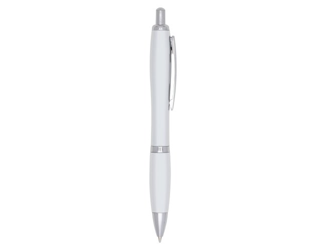 Caneta plástica branca com anel e detalhes prata. Clip de metal, aciona por clique.