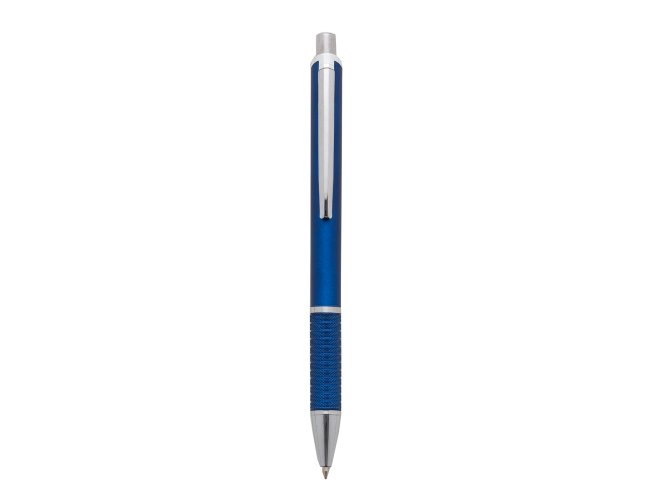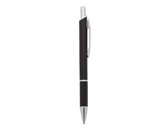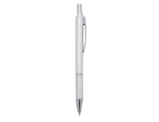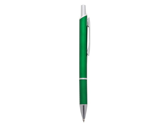 Caneta plástica fosca inteira colorida com detalhes prata. Clip de metal, anel prata e parte inferior da caneta possui detalhes com relevo, aciona por clique.