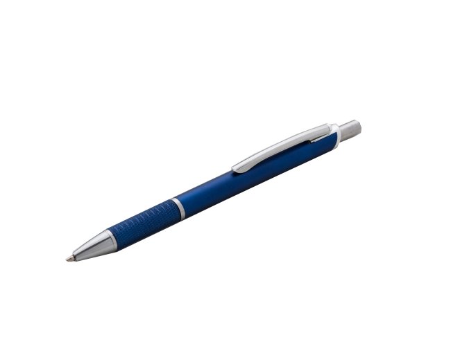 Caneta plástica fosca inteira colorida com detalhes prata. Clip de metal, anel prata e parte inferior da caneta possui detalhes com relevo, aciona por clique. Tamanho total aproximado (CxD): 14,9 cm x 1,4 cm. Peso aproximado (g): 8