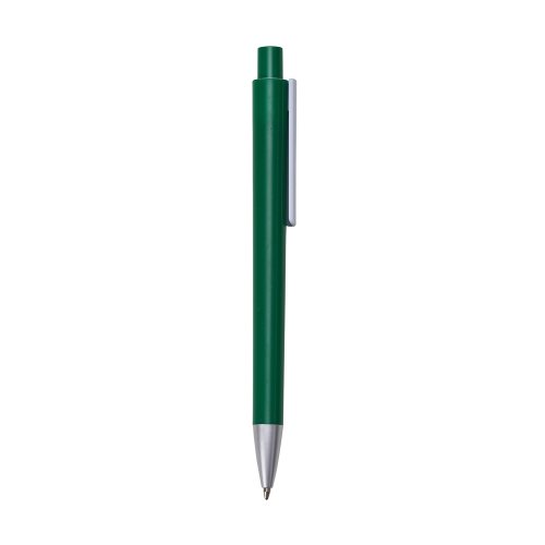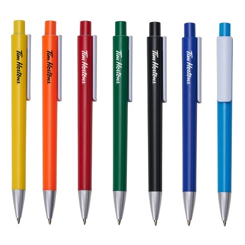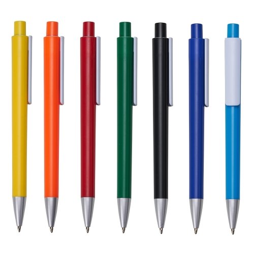 Caneta plástica colorida com clip branco. Parte superior do acionador com detalhe circular branco, ponteira prateada. Aciona por clique.
