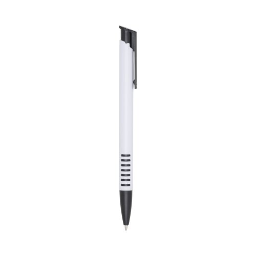 Caneta plástica corpo branco com detalhes coloridos. Clip plástico colorido e parte inferior com sete linhas coloridas. Aciona por clique.