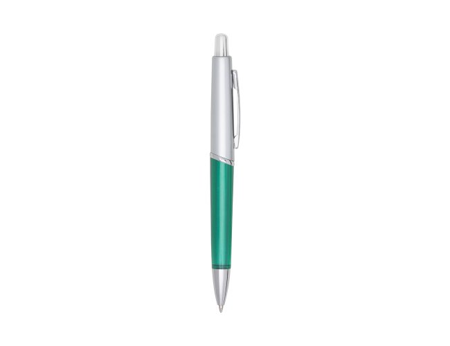 Caneta plástica prata com detalhes coloridos translúcidos. Clip de metal, aciona por clique.