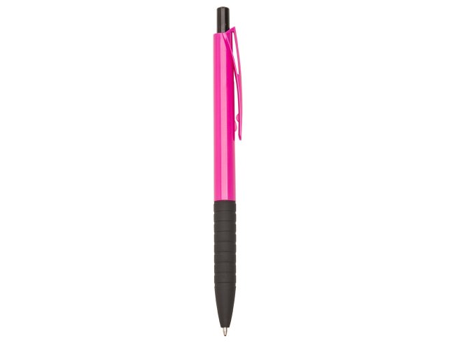 Caneta Plástica 401b colorida com detalhes preto. Clip plástico com detalhe vazado nas laterais, acionador e parte inferior preta com oito anéis em relevo. Aciona por clique.