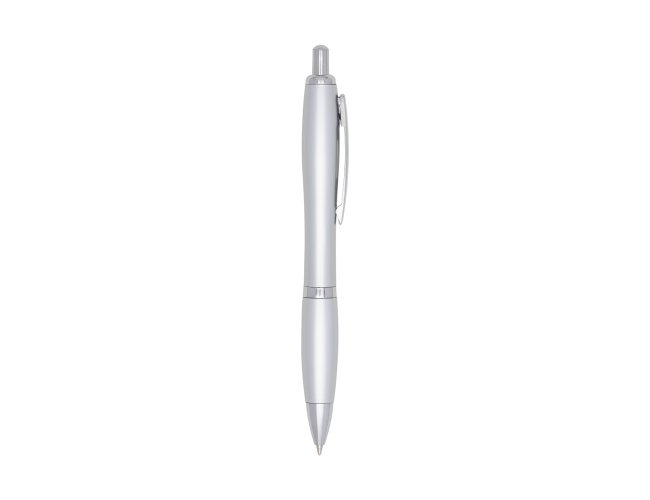 Caneta plástica prata com anel e detalhe emborrachado colorido. Clip de metal, aciona por clique. Tamanho total aproximado (CxD): 14,4 cm x 1,5 cm. Peso aproximado (g): 11