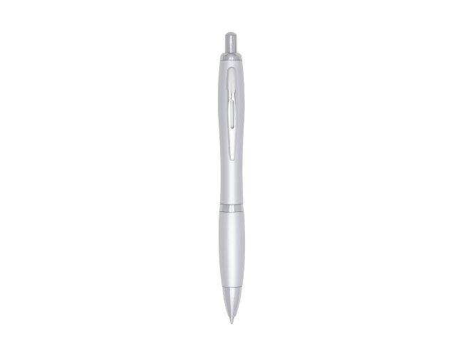 Caneta plástica prata com anel e detalhe emborrachado colorido. Clip de metal, aciona por clique.