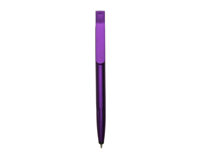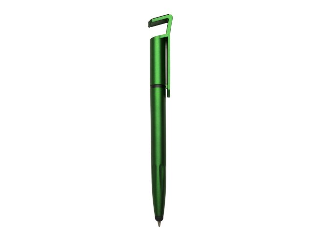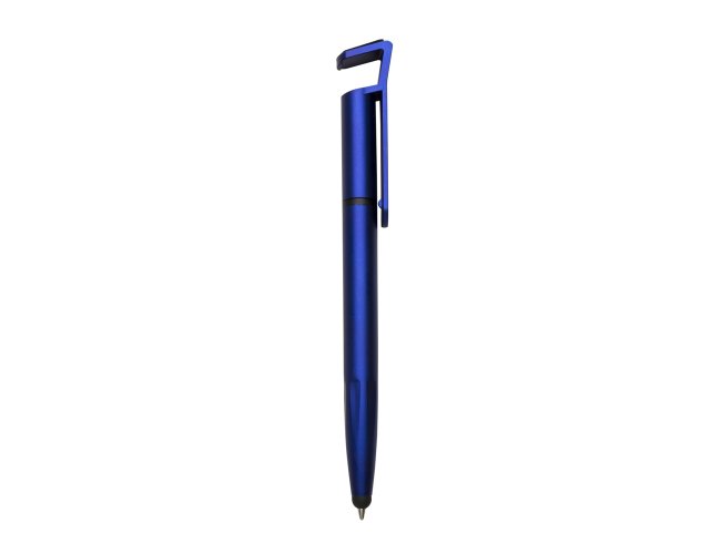 Caneta plástica com suporte para celular, ponteira touch screen e limpador de tela. Carga esferográfica azul 1.0 mm e acionamento por rotação.
