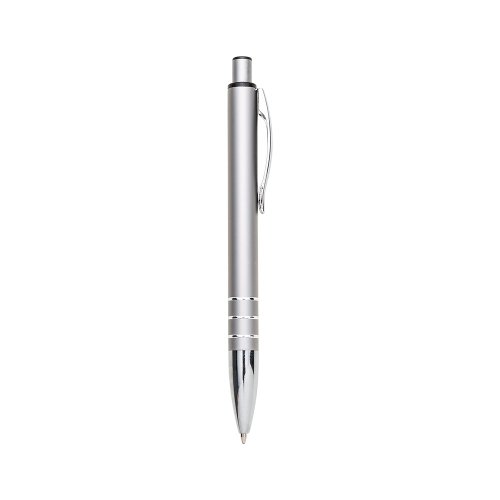 Caneta semi-metal colorida com 3 anéis prata na parte inferior. Clip metálico prata, parte superior do acionador em preto. Aciona por clique.