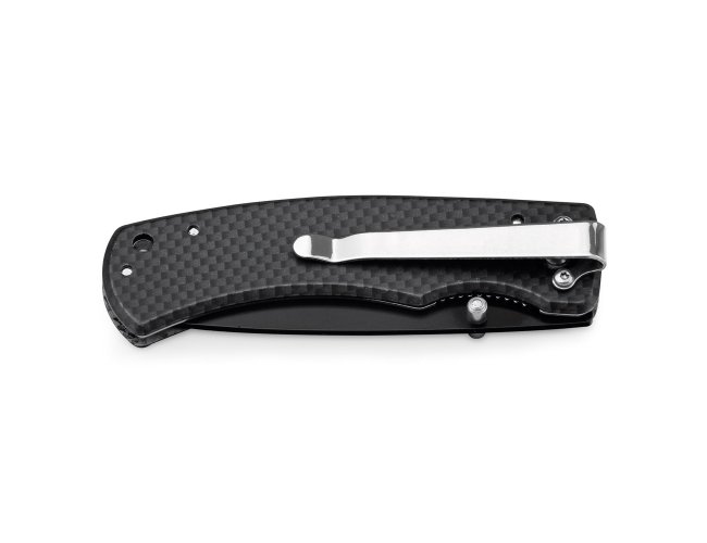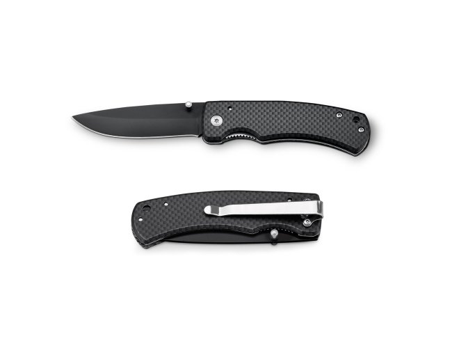 Canivete em aço inox e metal com fecho de segurança e clipe.