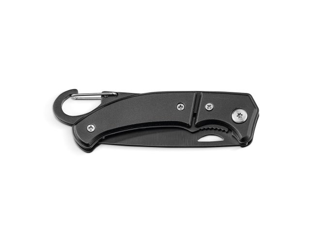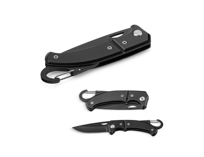 Canivete em aço inox e metal com fecho de segurança e mosquetão.