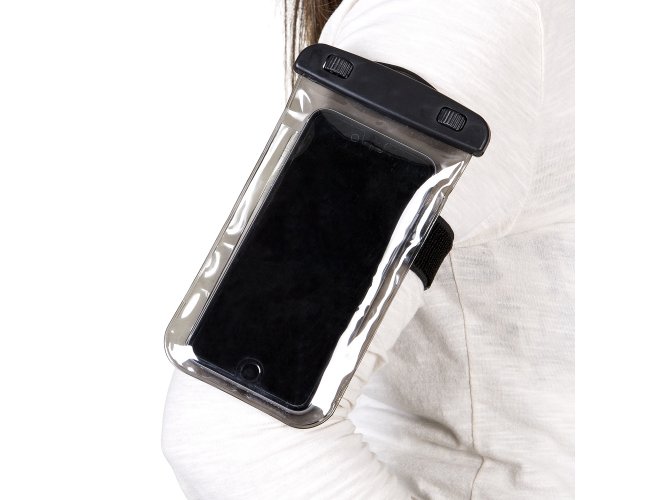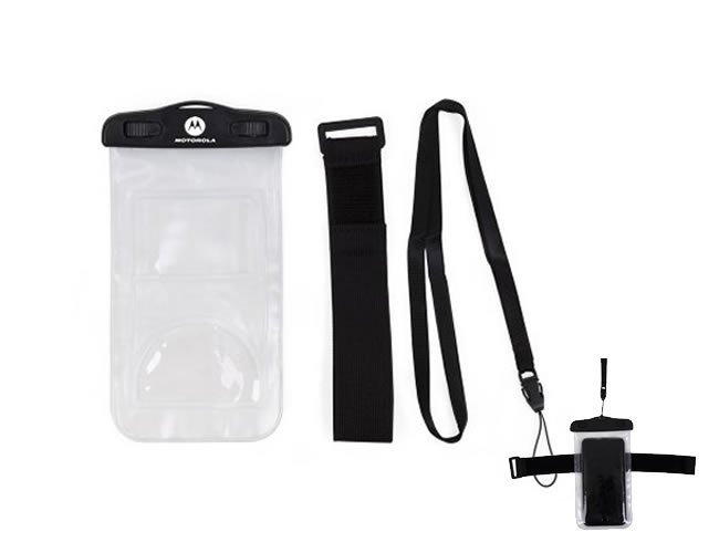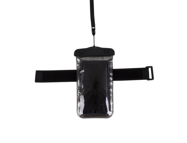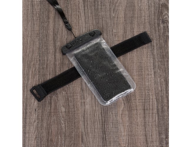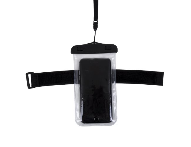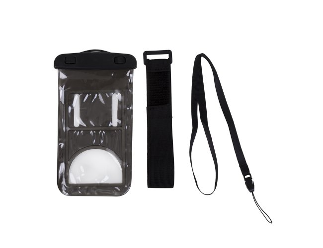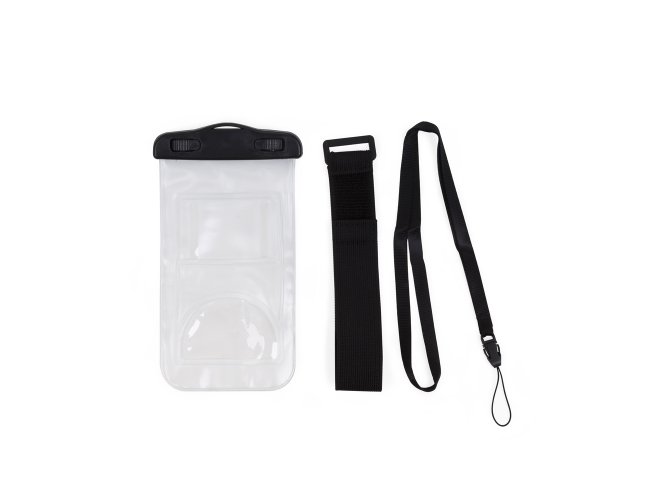 Capa a prova D'Água Universal Promocional 13136 com cordão de nylon de tamanho regulável, fabricado em PVC. Tamanho total aproximado (CxD): 20 cm x 11 cm. Peso aproximado (g): 42