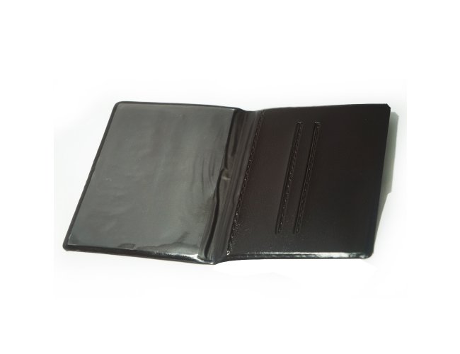 Porta-documento Bidins em couro sintético, capa frente e verso lisa, parte interna com bolso de visor plástico e três divisórias no próprio couro com bolso lateral.
