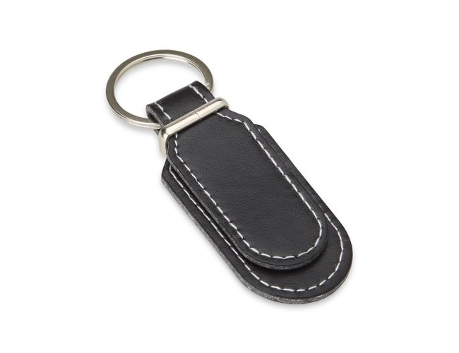 Chaveiro de couro sintético com detalhe em metal e frente e verso lisos.
