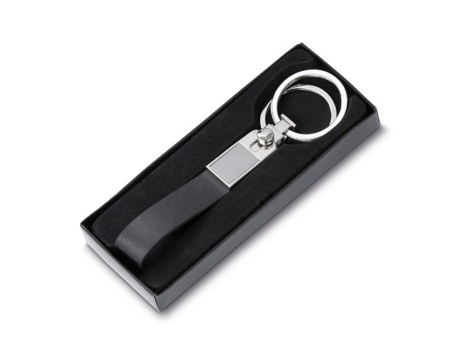 Chaveiro de metal com couro sintético preto com 2 argolas + caixa com berço aveludado. Engate rápido para uma argola. Área disponível para gravação em aço escovado.