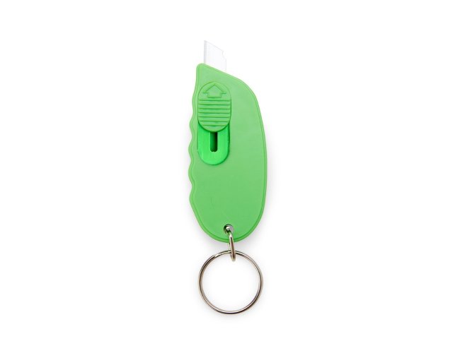 Chaveiro estilete projetado em plástico com sistema de retração automática para maior segurança. Após o uso, basta soltar o botão e a lâmina retorna automaticamente à posição de armazenamento, minimizando o risco de acidentes.