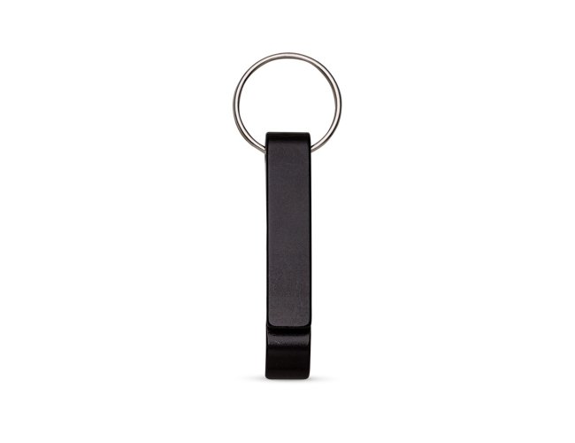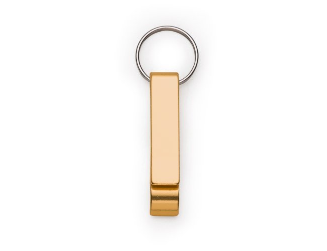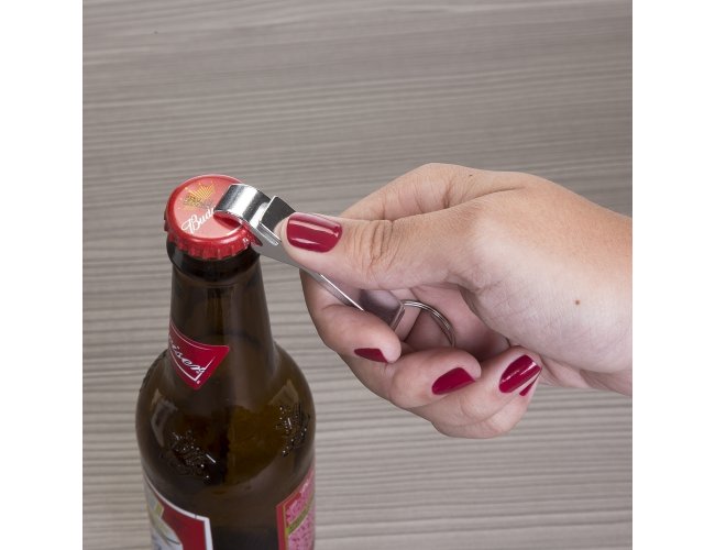 Chaveiro metálico com abridor de garrafas e argola de ferro niquelado.