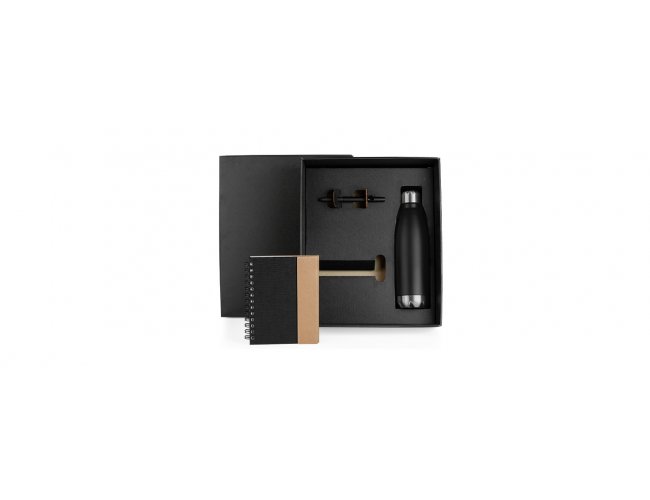 Kit composto por caderno espiral preto/bege com capa e caneta em papelão reciclado; garrafa em aço Inox preta com tampa rosqueável e caneta esferográfica em ABS preta.
