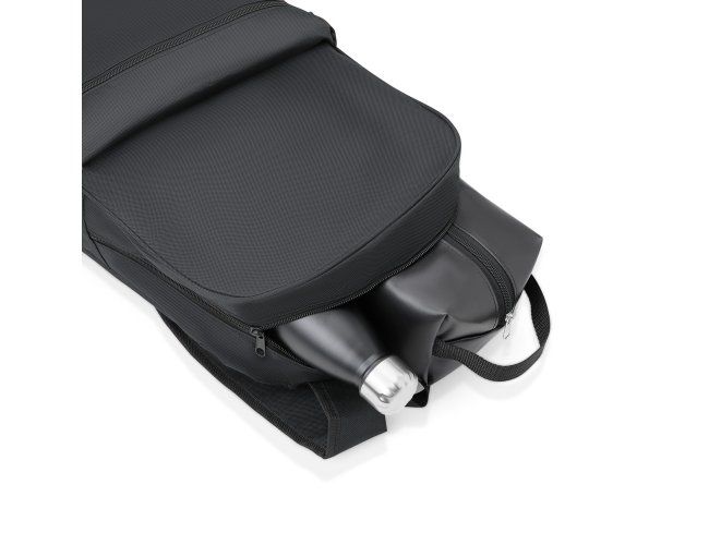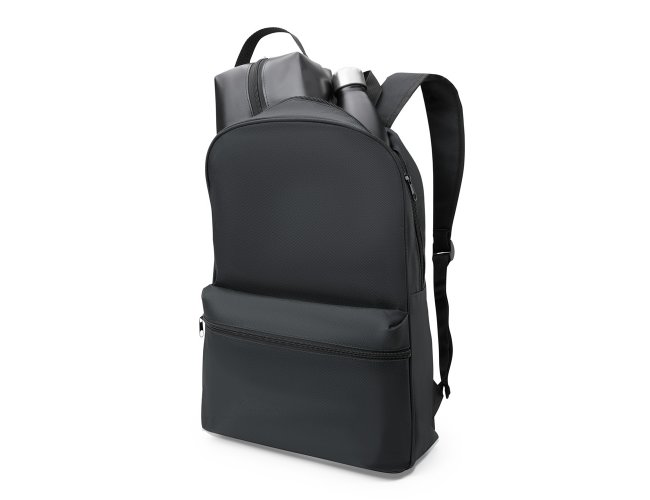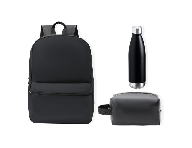 Conjunto Mochila, necessaire e garrafa. Composto por mochila preta confeccionada em Polyester 600D; necessaire com alça em material sintético na cor preta e garrafa em Aço Inox preta com tampa rosqueável.